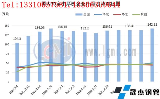 截止2022年5月27日,據(jù)云商平臺(tái)監(jiān)測(cè)數(shù)據(jù)顯示,國內(nèi)中厚板社會(huì)庫存量約為115.5萬噸,環(huán)比增加1.6萬噸左右,月同比增加10.4萬噸左右,年同比增加約2.9萬噸左右。5月份30家樣本鋼企庫存量呈現(xiàn)持續(xù)增長走勢(shì),截止5月27日,追蹤國內(nèi)30家中板鋼企庫存量約為46.6萬噸,與4月份相比基本持平,其中華北區(qū)域14家樣本企業(yè)廠內(nèi)庫存約為22.7萬噸,同比4月份同期增加約5.5萬噸左右,華東區(qū)域12家樣本企業(yè)廠內(nèi)庫存約為15.2萬噸,同比4月份同期下降約2萬噸左右,除華北、華東區(qū)域外,11家樣本企業(yè)廠內(nèi)庫存約為8.7萬噸,同比4月份同期基本持平。