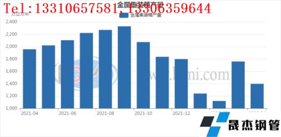 國內(nèi)下游產(chǎn)品供應(yīng)分品種來看,4月份國內(nèi)金屬集裝箱產(chǎn)量為1398.4萬立方米,環(huán)比3月份增產(chǎn)約363.3萬立方米。同比21年同期下降約561.9萬立方米。
