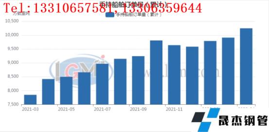 4月份國內(nèi)手持船舶訂單量累計(jì)為10247萬載重噸,環(huán)比3月份增長約337萬載重噸。同比21年同期增加約1828萬載重噸。