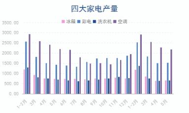 1-5月份,冰箱產(chǎn)量3401.0萬臺,同比下降8.1%;彩電產(chǎn)量7441.0萬臺,同比增長4.5%;洗衣機產(chǎn)量3471.7萬臺,同比下降4.1%;空調(diào)產(chǎn)量9933.5萬臺,同比下降0.8%。