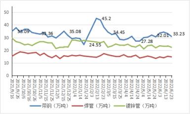 焊鍍管廠產能利用率靈活下降。6月在統計管廠總產量145.46萬噸,月比增產7.51萬噸,月中下旬產能利用率逐步下降至60%左右,周末倒班減產,整體在統計管廠影響產量在14萬噸上下,占總產量的22.7%。截至6月23日,天津唐山邯鄲主流管廠廠內總體庫存68.01萬噸,比上月增1.86萬噸。進入6月,疫情形勢好轉,主導管廠協議原料陸續到庫,但行情突降,生產利潤進入洼地,管廠快速調整產能應對,引導供需向再平衡過渡,整體來看,博弈階段仍存一定壓力(見圖4)。