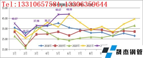 2022年6月份,中國不銹鋼出口量為48.99萬噸,創歷史新高!環比增加0.32萬噸,增幅0.65%;同比增加0.29萬噸,增幅0.61%。