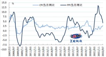 7月份,工業生產者出廠價格同比漲幅較上月回落1.9個百分點,同比漲幅回落速度加快,環比自今年2月份以來首次下降,且降幅較大。海外主要經濟體經濟增速放緩,貨幣政策持續收緊,需求收縮壓力加大,后期PPI同比漲幅將保持回落趨勢。