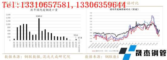 綜合而言,廢鋼供應的多寡其實與厚壁鋼管的需求息息相關,無論折舊廢鋼、加工廢鋼還是自產廢鋼都與國內厚壁鋼管的消費有直接的關聯,而進口廢鋼的增減在一定程度上也可以反映國外厚壁鋼管消費的好壞,所以廢鋼的供應量實際上也是一個反映需求的指標,這從廢鋼供應基地庫存與五大材表需的相關性也可得到佐證。